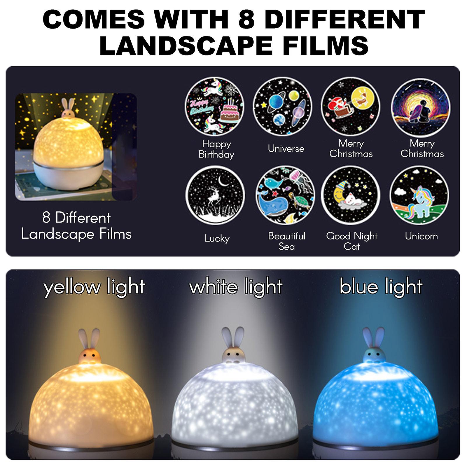 Features:The rabbit night light is suitable for children, creating a warm and relaxing atmosphere, good for accompanying your kids to sleep.Comes with 8 different landscape films, the projector lamp will display various themes on your ceilings or walls, creating an interesting and comfortable bedtime for children.3 light colors: yellow, white and blue; 3 levels brightness, meet your various needs.Built-in lithium battery, USB charging, compact size, convenient to use anywhere you like.A wonderful gift for children, great for decorating baby and kids bedroom, children's day and parties.Specifications:Light Color: Yellow, White, BlueRated Voltage: 5VRated Power: 2.7WService Life: 500000HMaterial: PVCColor: WhiteWeight: 430g/15.2ozSize: 14*13.5*13.5cm/5.5*5.3*5.3inPackage List:1*Projector Lamp8*Different Landscape Films1*USB Cable1*Manual- Brand: Gegong
